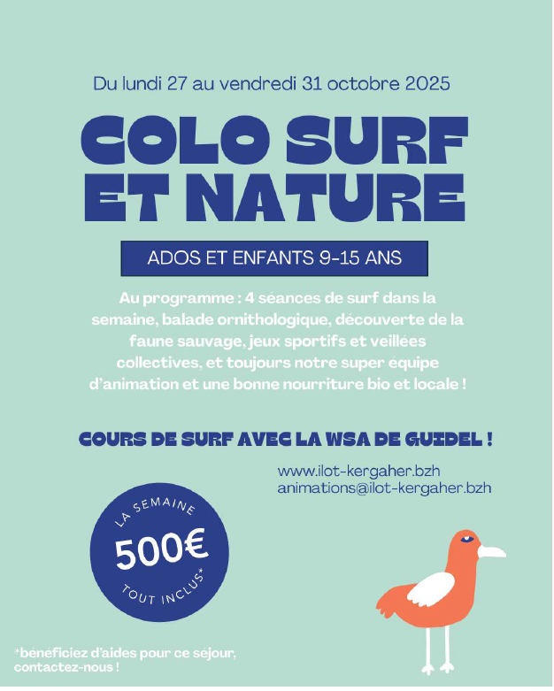 Voici le lien direct pour s’inscrire au séjour : https://www.helloasso.com/associations/l-ilot-de-kergaher/evenements/colo-surf-et-multi-activites-nature-9-15-ans-du-27-au-31-octobre-2025